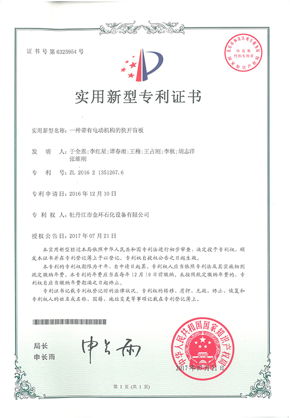 一種帶有電動(dòng)機(jī)構(gòu)的快開盲板實(shí)用新型專利證書ZL 2016 2 1351267.6